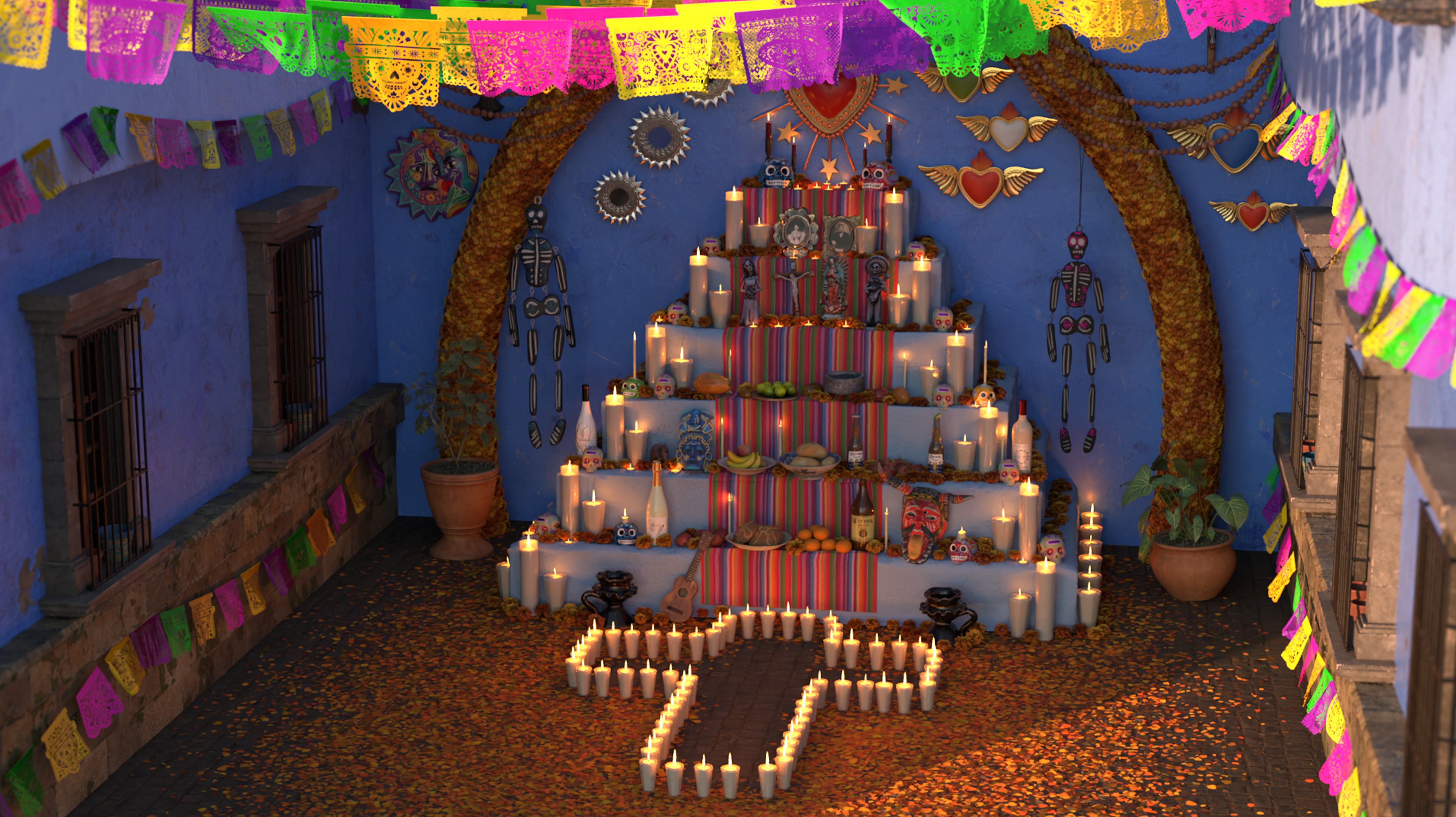 In diesem Projekt habe ich eine traditionelle mexikanische Ofrenda zum Día de Muertos in 3D erstellt, um meine Interpretation dieses Brauchs im digitalen Raum zu präsentieren. Meine Arbeit stützt sich auf die anthropologischen Analysen von Stanley Brandes und Claudio Lomnitz über die Atmosphäre von Totenaltären. Mein Ziel war es, ein digitales Umfeld zu kreieren, das ohne die physischen Elemente wie den Duft von Copal und Blumen oder die Wärme der Kerzen auskommt. Allein durch das visuelle Design wollte ich erreichen, dass der Betrachter dieselben tiefen Emotionen spürt, die man beim Besuch einer echten Ofrenda erlebt.
